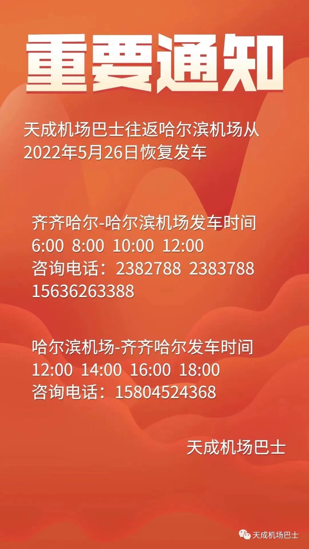 黑龍江天成運(yùn)業(yè)集團(tuán)齊齊哈爾客運(yùn)有限公司機(jī)場(chǎng)巴士往返于齊齊哈爾與哈爾濱太平國(guó)際機(jī)場(chǎng)間,全程運(yùn)行約3小時(shí)50分鐘。行程360公里,中途在大慶紅湖服務(wù)區(qū)停靠5分鐘,大慶機(jī)場(chǎng)可上下。